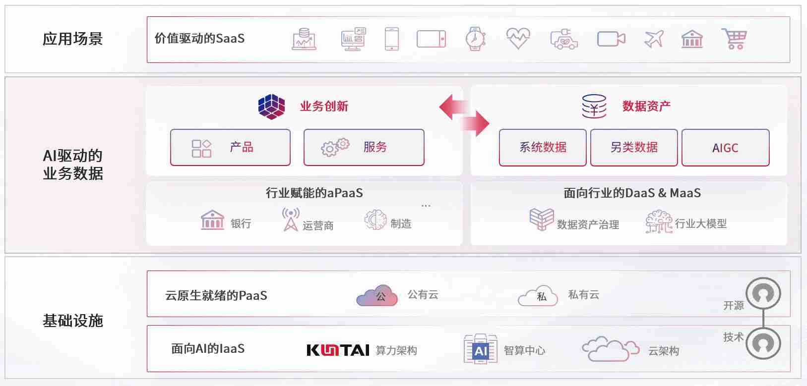 数字时代,,围绕企业数字化转型的关键要素,,3223.bet数码开创性的提出数云融合战略和技术体系框架,,着力在云原生、、、数字原生、、、、AI原生和信创产业上架构产品和服务能力,,,为处在不同数字化转型阶段的快消零售、、汽车、、、、金融、、医疗、、、政企、、教育、、运营商等行业客户提供泛在的敏捷IT能力和融合的数据驱动能力,,,构建跨界融合创新的数字业务场景和新业务模式,,,,助力企业级客户建立面向未来的核心能力和竞争优势,,全面推动社会的数字化、、智能化转型升级。。。