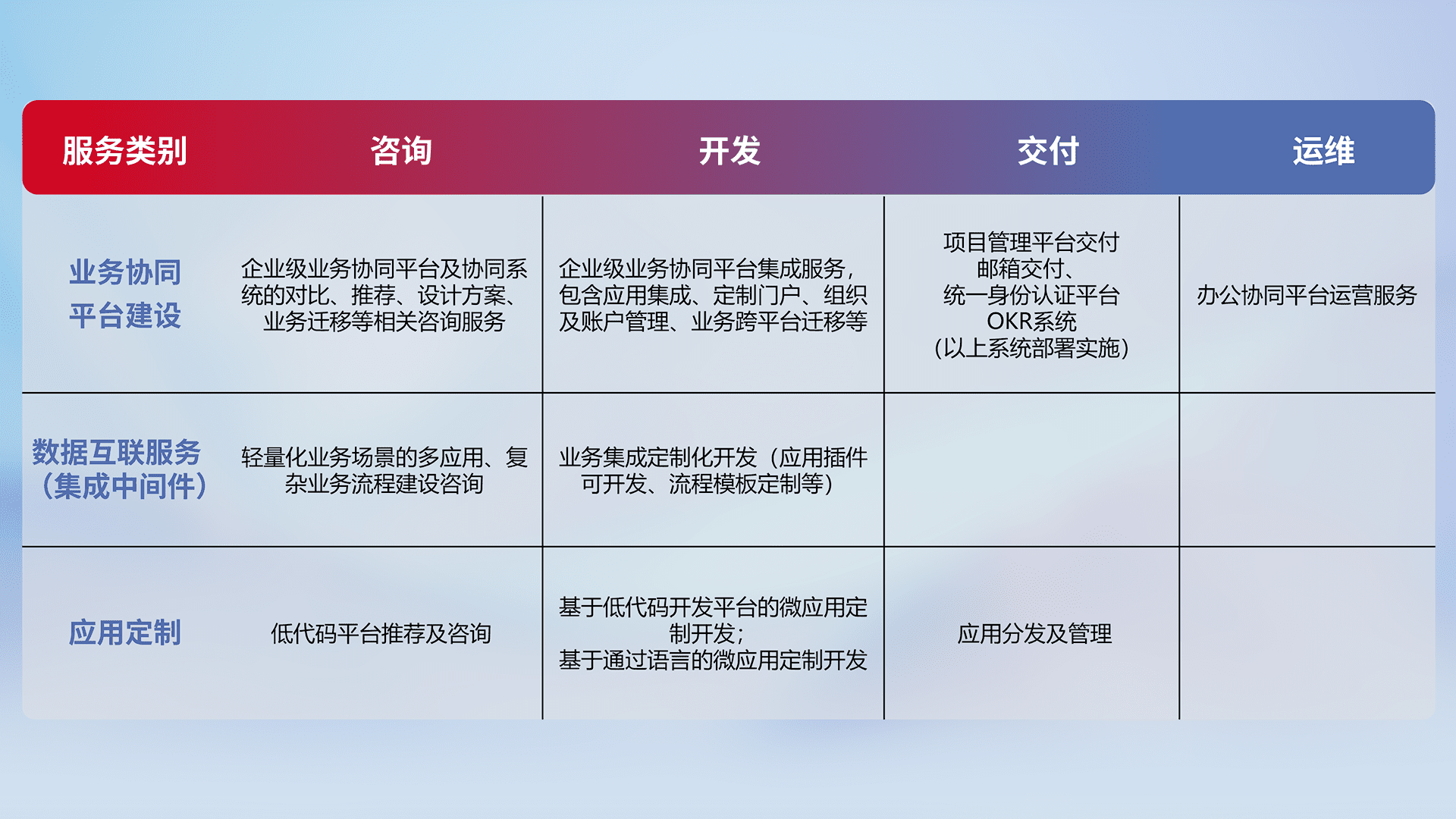 针对钉钉、、企微、、IDaas等平台级产品提供产品的规划、、、方案、、、交付、、、、定制化开发等服务,,,实现如统一协同办公、、、、智能客户服务、、、、混合会议管理、、、智能数据查询、、、等业务场景,,,,实现数字化转型。。。
