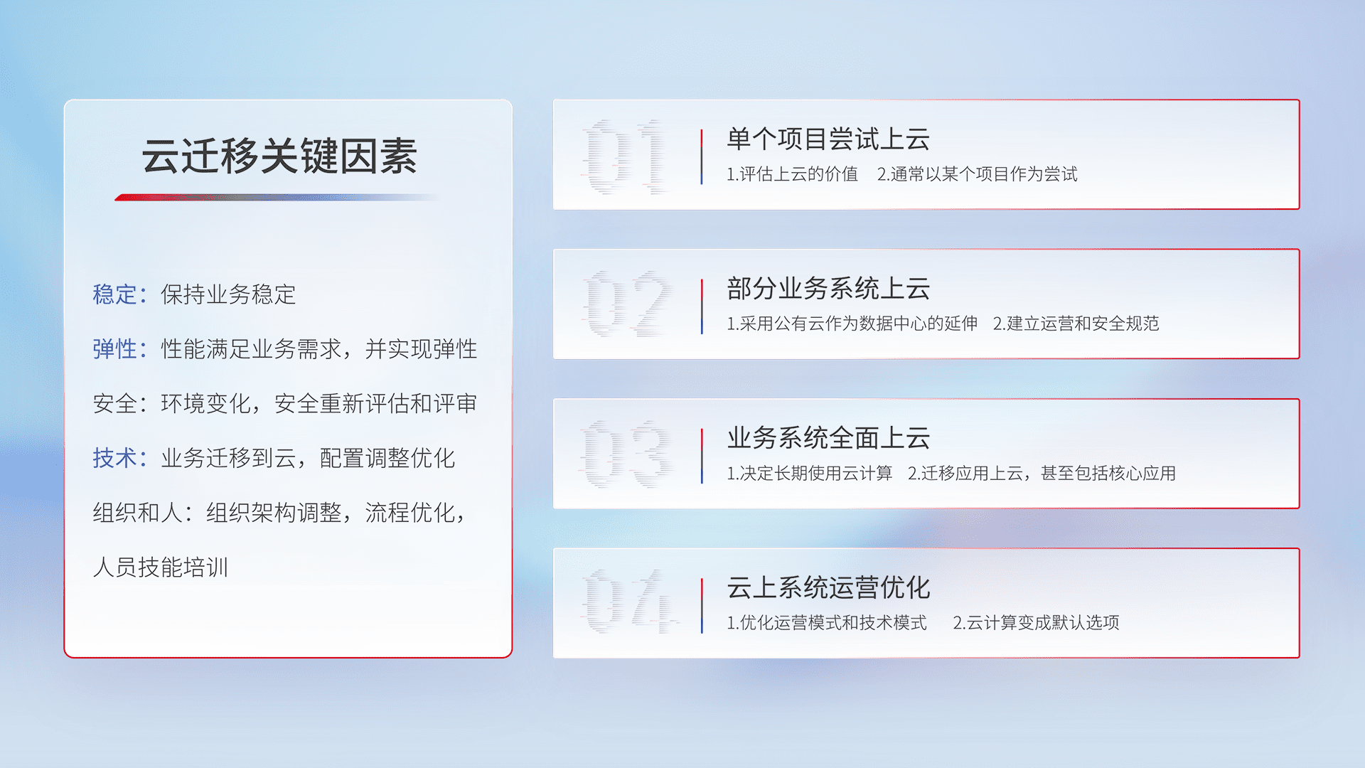 结合实际业务,,从规划设计、、、云平台选型、、、、云原生改造、、数据迁移、、、、集成交付,,,,迁移全过程为客户识别最佳上云路径,,,做好风险识别管理,,设计网络架构、、身份权限、、、、安全审计合规、、、操作审计、、、、日志审计、、、监控告警策略、、、、多站点容灾设计等,,,对云上基础设施进行整体规划,,提升IT治理水平,,以满足弹性、、、高可用、、高性能的需求。。