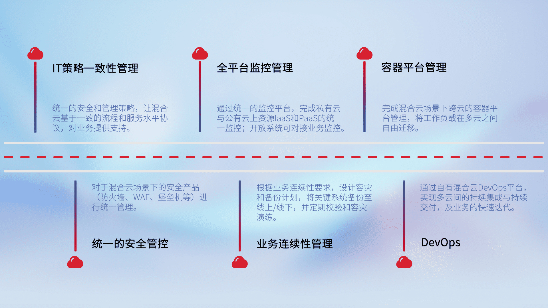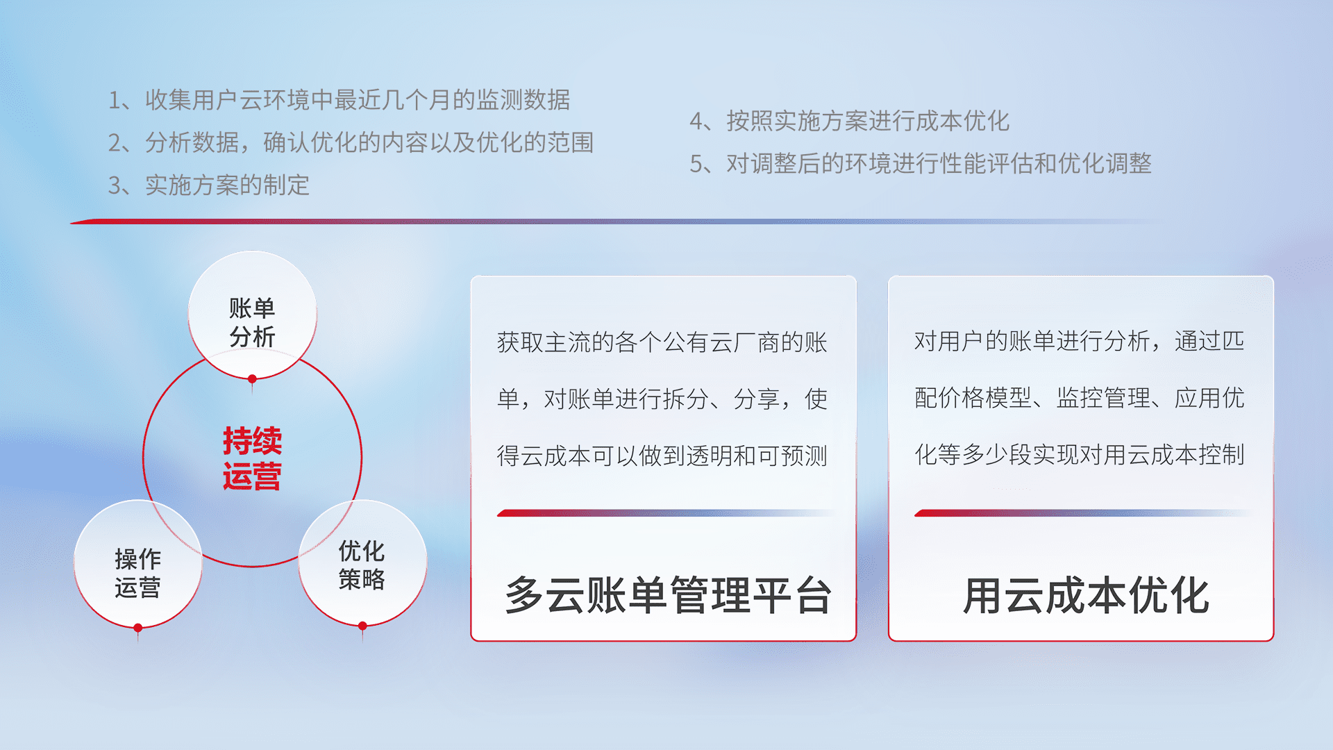 通过多云纳管,,以统一的资源数据模型把客户的云资源进行抽象和封装,,,,进而实现对多云资源的统一操作,,,,保障云资源管理的可靠性、、稳定性与可用性。。。量身定制化运维内容,,配置、、、、开发运维、、、补丁管理、、备份、、、监控、、、、认证和访问管理、、审计和日常巡检等,,,,保障在用云过程中的可靠度,,,稳定度以及高可用率。。。
